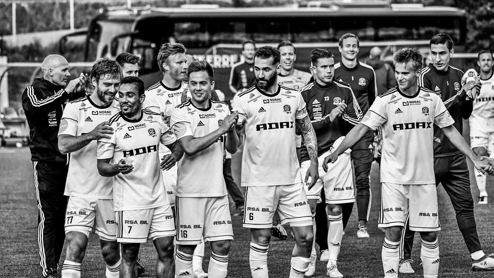 JUBEL OG TAKKNEMLIGHET: Spillerne takker Forza Arendal for hjelpen etter kampen. Fra venstre: Markus Håbestad, Mads Nørby Madsen, Ulrik Reinaldo Berglann, Kim Kvaalen, Avni Pepa, Conrad Wallem, Preben Skeie og Reiss Greenidge.