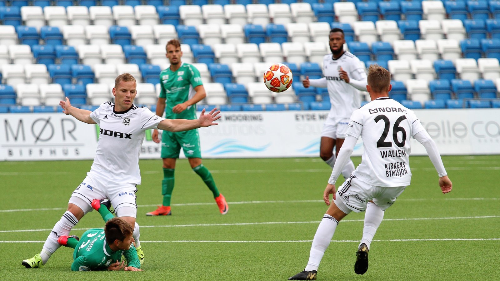Rundt 45 minutter var spilt av første omgang da Mads Nørby Madsen kom til en heading, men under press gikk avslutningen utenfor.