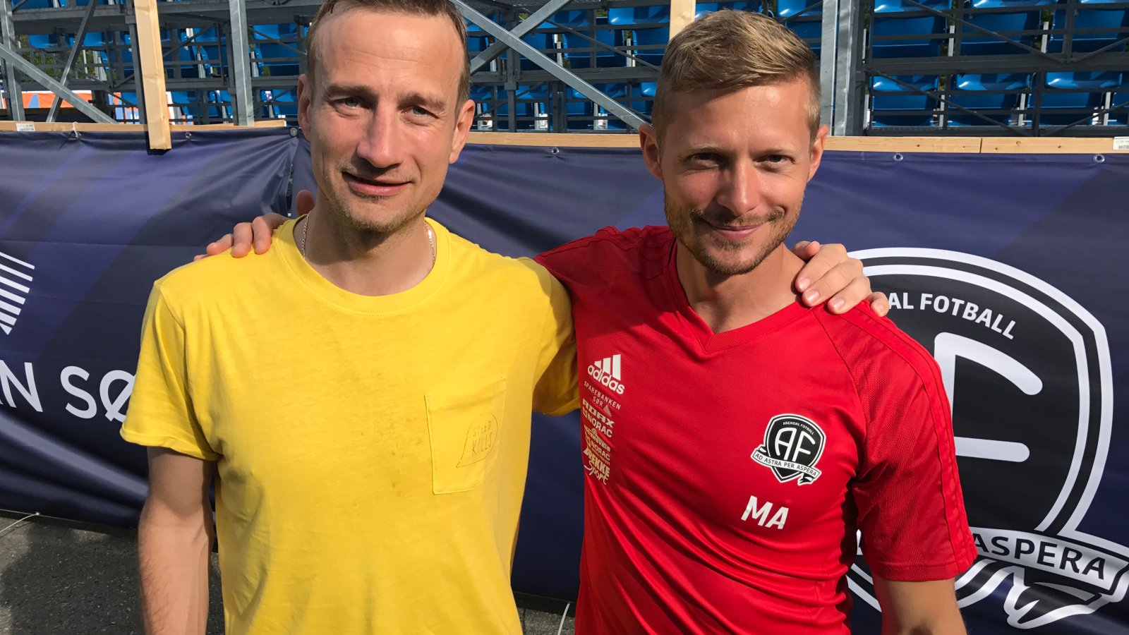 Mattias Andersson og Petar Rnkovic er gamle venner etter at de ble kjent med hverandre som lagkamerater i Strømsgodset i 2006. Nå er de altså gjenforent - som trener og spiller i Arendal Fotball. Og faktisk er det slik at treneren er den yngste av dem....