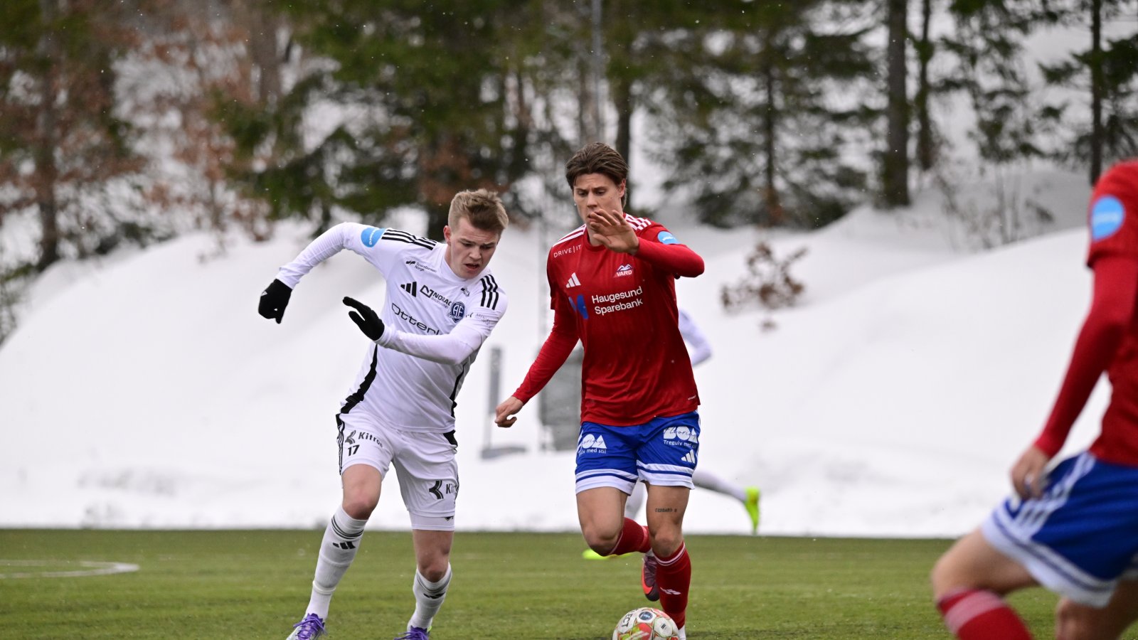 Foto: Helge N. Olsen - Arendals andre målscorer duellerer om ballen med en Vard-spiller.