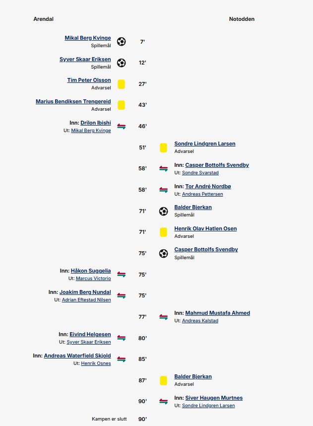 Arendal fortsetter å kjøre kampen, men etter 25-30 minutter mister Arendal initiativet, og Notodden blir invitert inn i kampen. Etter hvert skaper også Notodden noen sjanser, og får uttelling i det 71. og det 75. minutter. Det er tydelig at det er Notodden som er mest fornøyd med resultatet, og Arendal jager seieren mot slutten. Til tross for et par store sjanser for hjemmelaget blir det ikke noen flere scoringer og kampen ender med 2-2 og poengdeling.