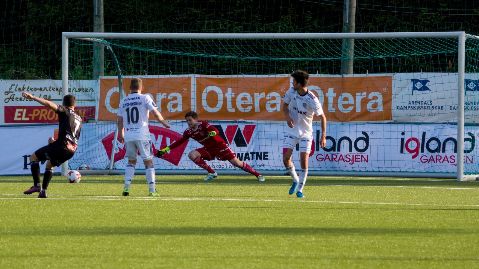 0-1 etter 37 minutter: Arendal har kontroll i eget forsvar, men slår en ball rett i beina på en Elverum-spiller på ca 25 meter. De blir stanset på vei inn i boksen og dommeren blåser frispark på 17 meter. Frisparket går via muren og havner hos en Elverum-spiller som dunker inn ledelse til bortelaget.