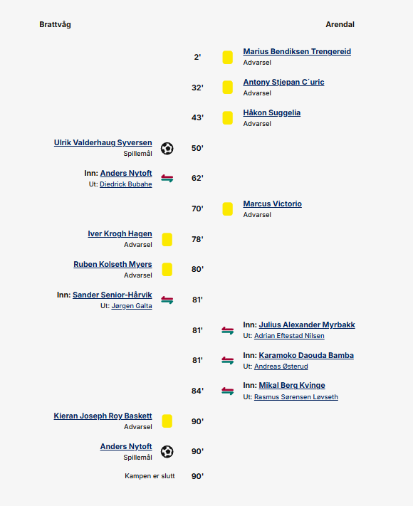 Lagene gikk til pause med 0-0, men Arendal fikk en forferdelig start på andre omgang med en tidlig Brattvåg-scoring. Vi gir bort en unødvendig corner, og blir staffet da ballen faller ned i beina på Brattvåg-stopper Ulrik Syversen på bakerste stolpe. Han vender og setter ballen forbi Andreas Smedplass. Arendal jakter utligning, og har noen gode sjanser og tilløp til sjanser uten at det blir noe tellende resultat. På overtid, etter at Arendal har sendt alle i angrep, får Brattvåg-spiss Anders Nytoft løpe upresset med ball fra egen halvdel og punkterer kampen.